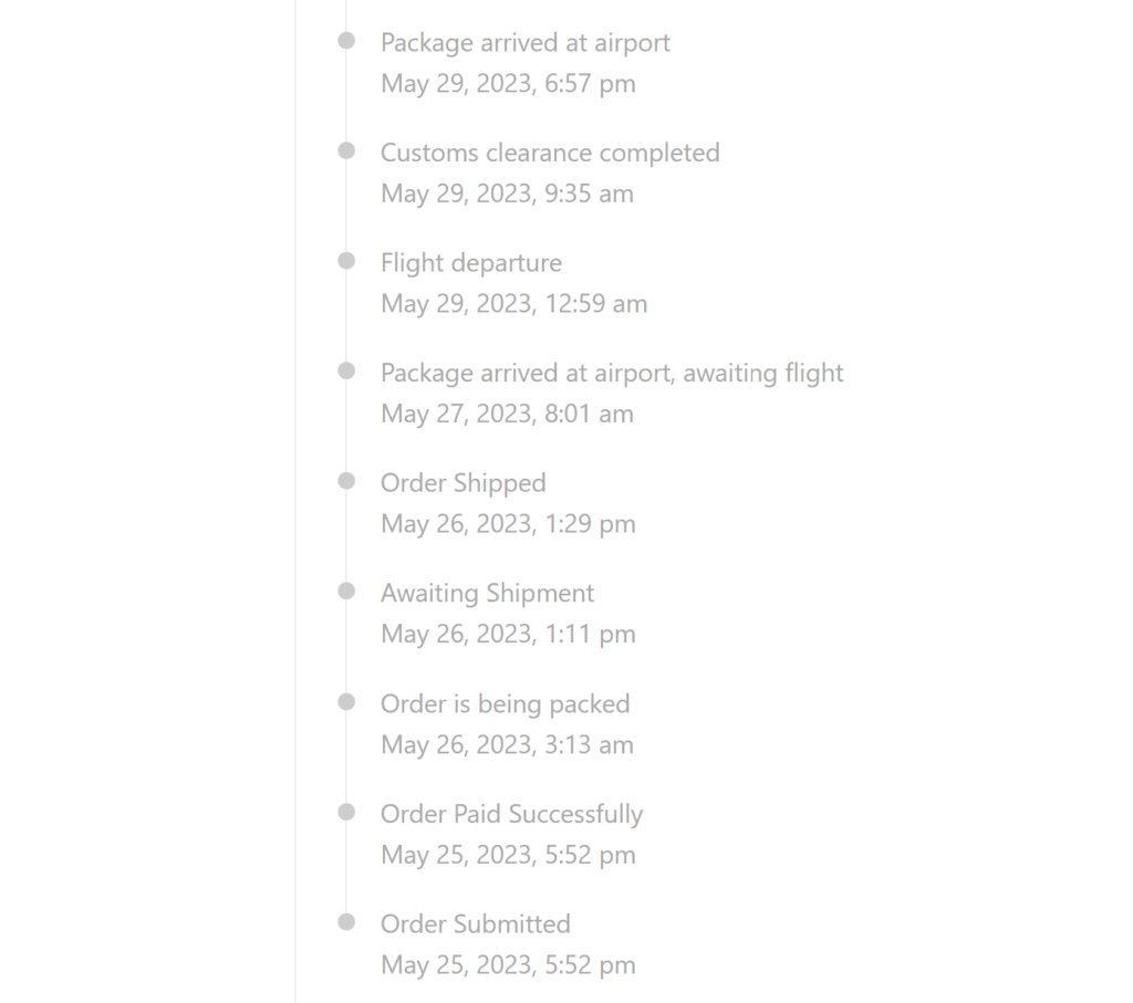 唯一トラッキングできてない期間というのは、発送元の国を出発してからアメリカに届くまでの間(おそらく空便)のみです。発送前も「準備中→配送」というのはもちろん出てますし、アメリカに着いたら検疫前後も見れます。